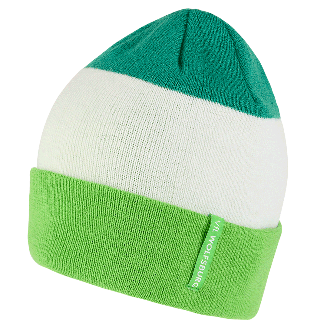Tolle VfL Wolfsburg Strickmütze in dunkelgrün-weiß-hellgrün mit einem länglichen VfL Wolfsburg Looplabel an der Seite. Ansonsten ist diese Mütze schlicht gehalten und ein praktisches Accessoires für kühle Stadionbesuche.