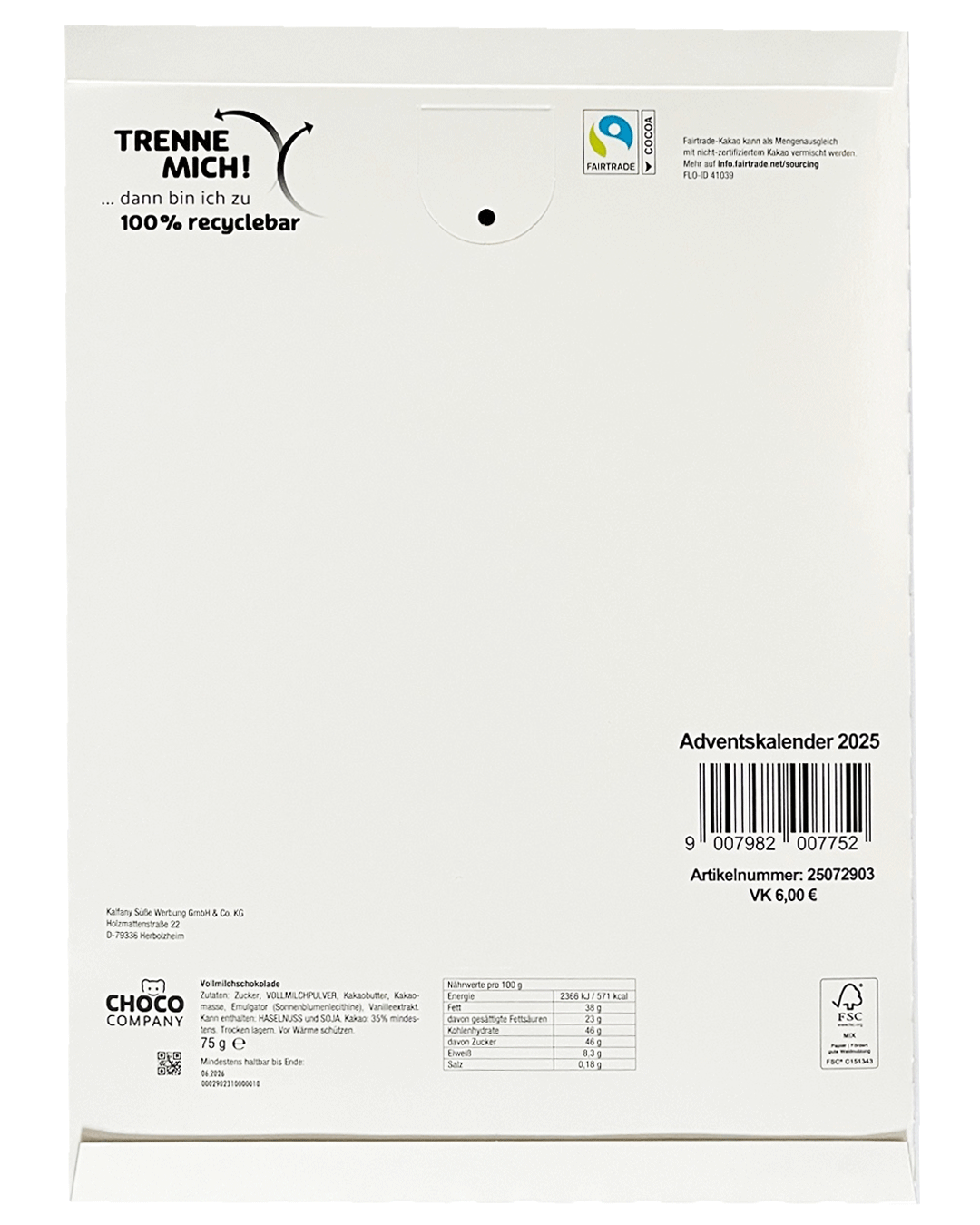 - 24 doors filled with the finest Fairtrade-certified milk chocolate (75 g), made in Germany