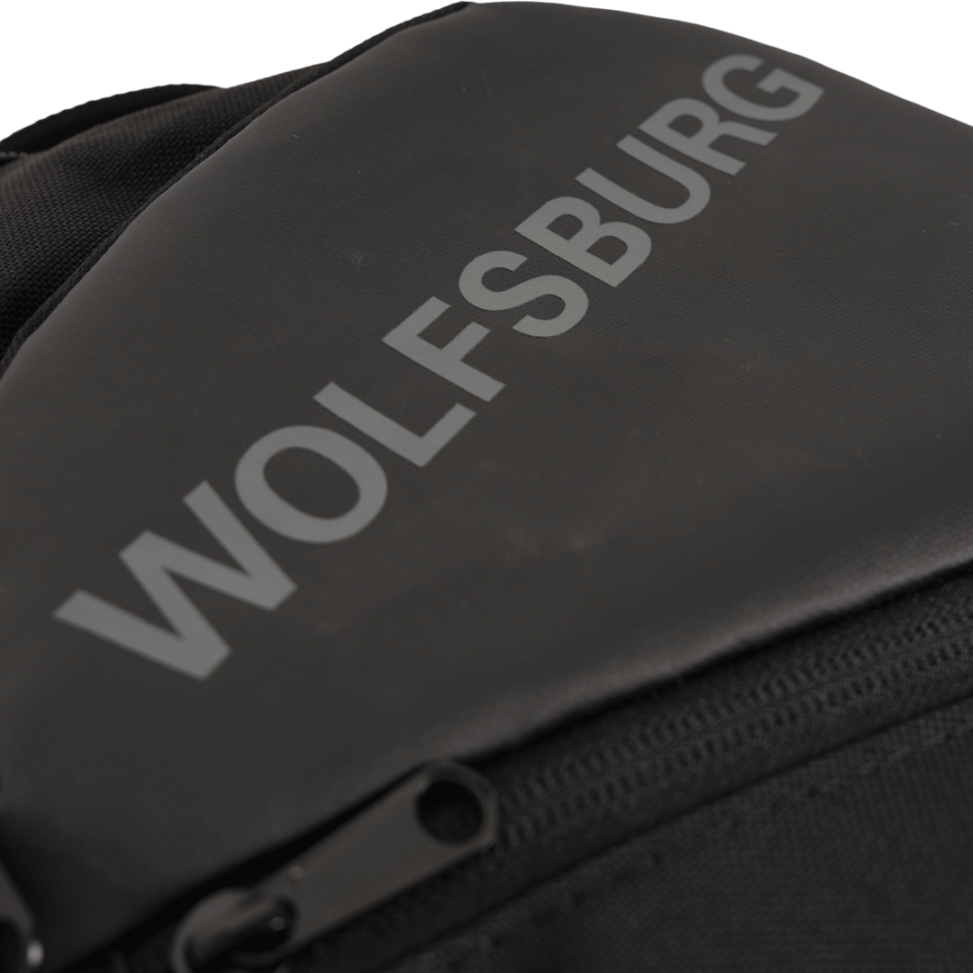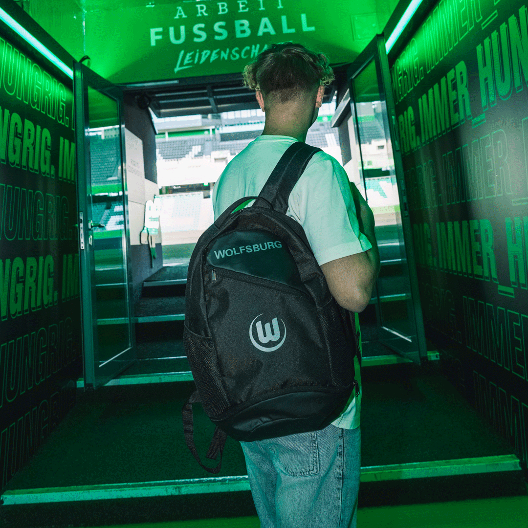 Great black VfL Wolfsburg backpack made of recycled material with a large inner compartment and small outer compartments. The padded back and the individually adjustable straps provide an optimal and comfortable fit.