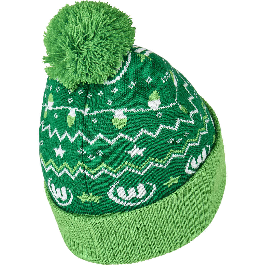 Our VfL Wolfsburg Christmas logo knitted hat will make you look forward to Christmas and will also keep you nice and warm. The Christmassy winter pattern and light green bobble make for the perfect pre-Christmas look.