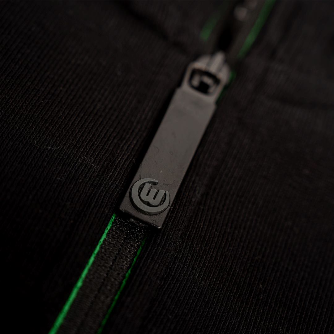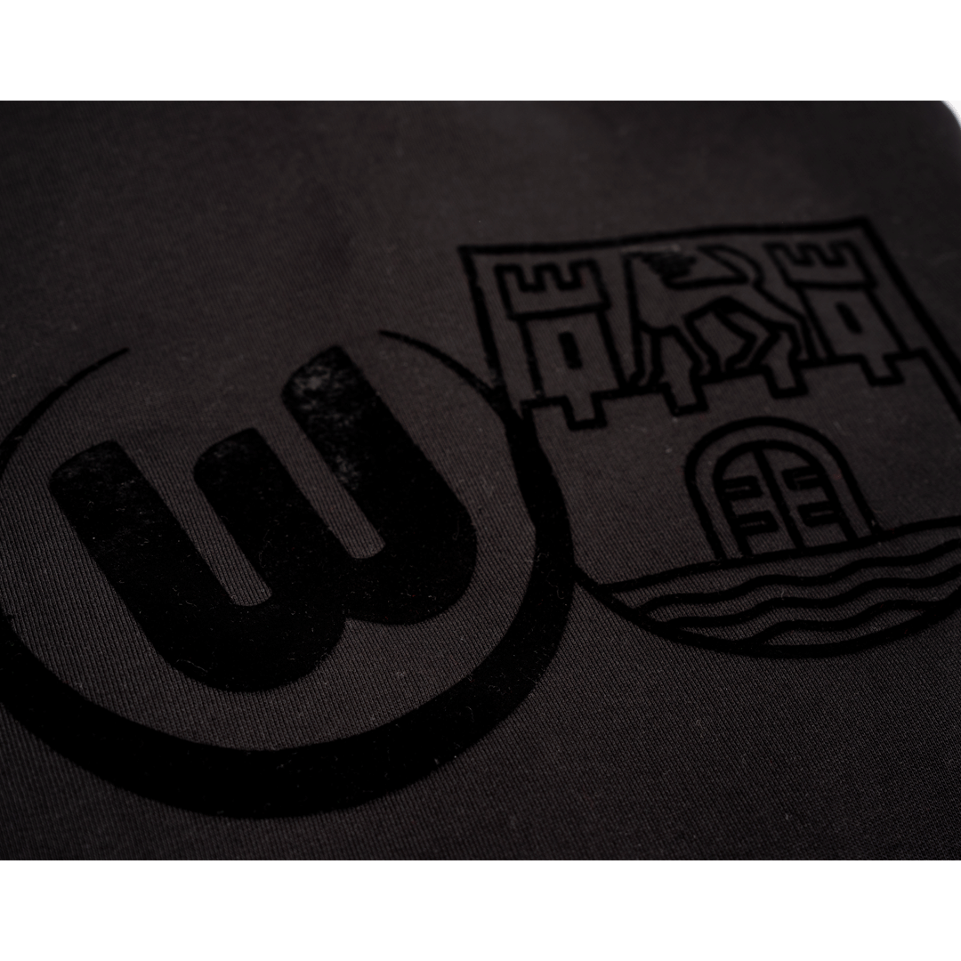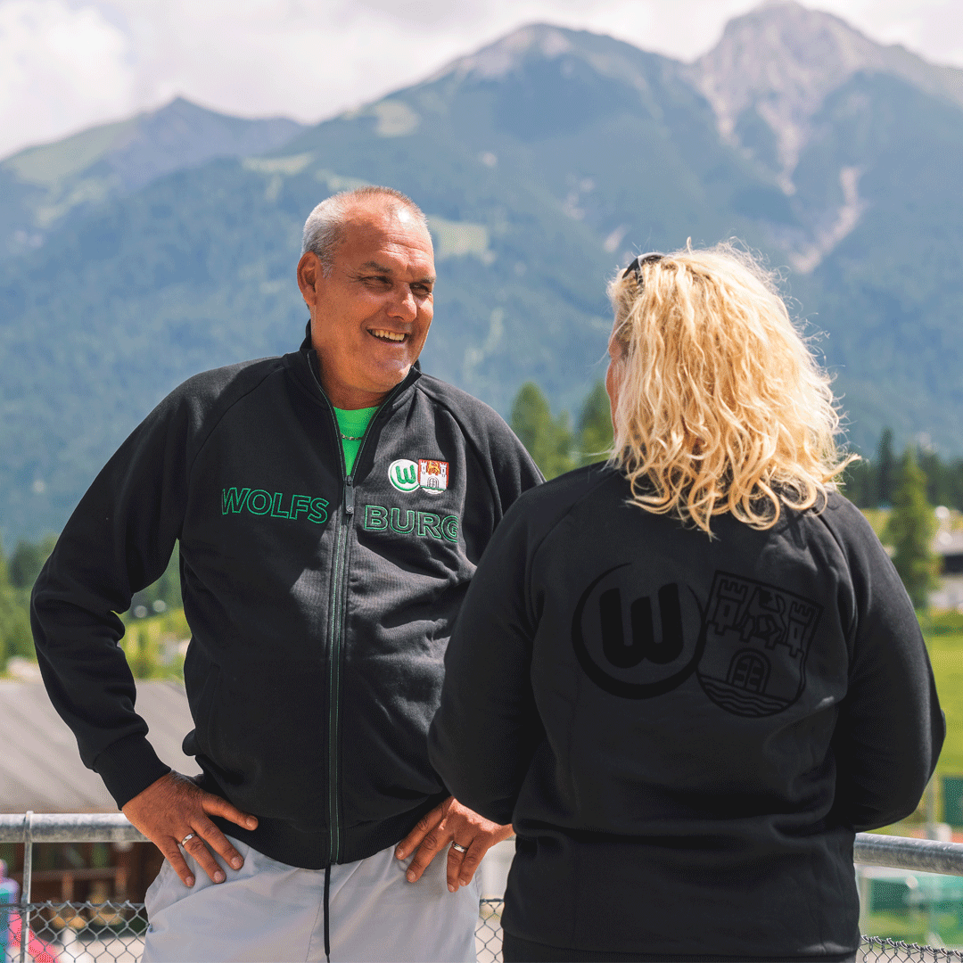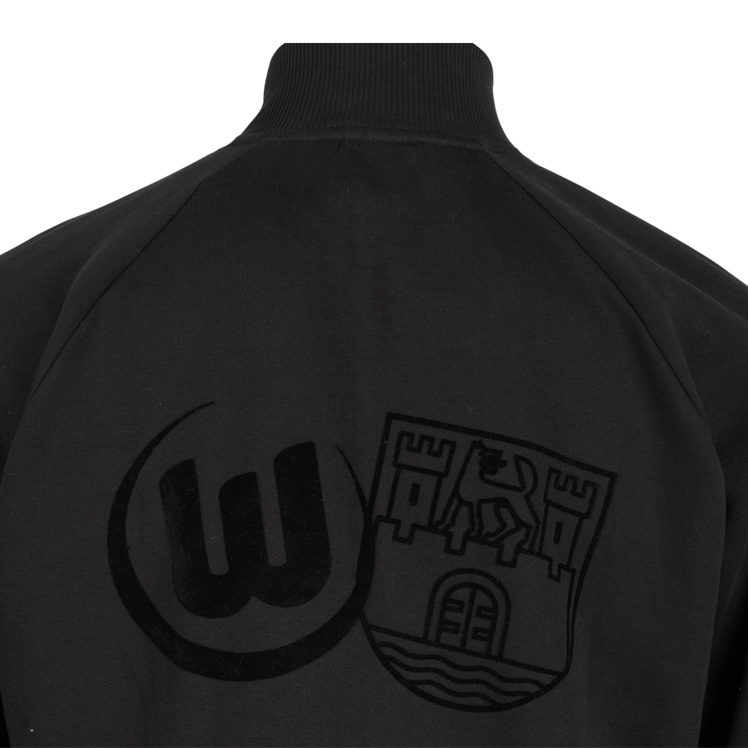 Black VfL Wolfsburg fan jacket with stand-up collar, two side pockets, a front zipper with VfL logo branding and high-quality embroidery of the VfL logo and the city emblem of Wolfsburg on the front as well as the lettering WOLFSBURG.