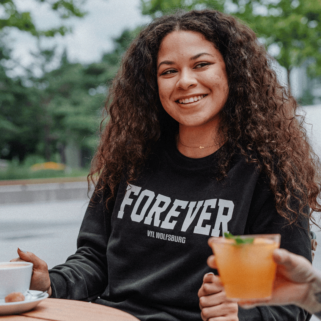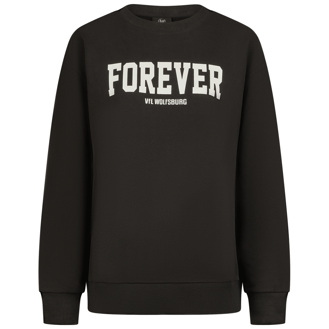 The black VfL Wolfsburg sweater FOREVER in streetwear style is a real eye-catcher that goes with any outfit.