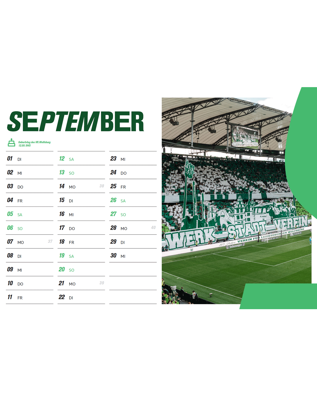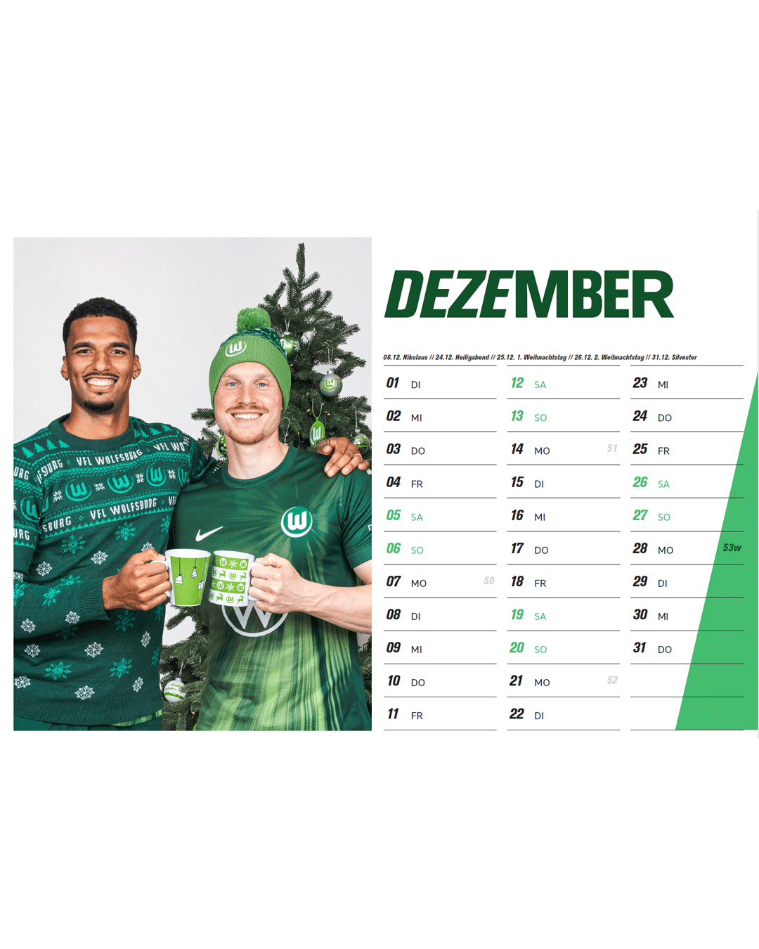 Mit dem VfL Wolfsburg Posterkalender 2026 unserer Wölfe erlebst du das ganze Jahr über die Highlights deiner Lieblingsmannschaft – Monat für Monat im Großformat.