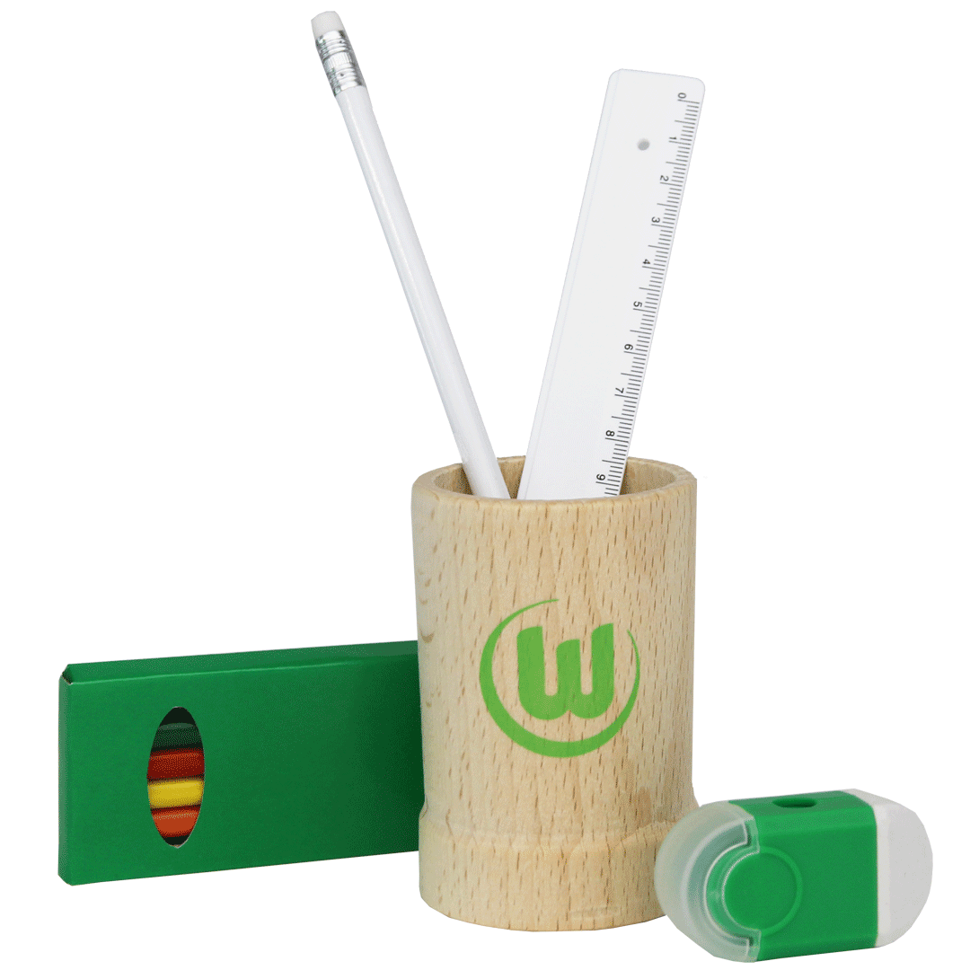 Praktischer VfL Wolfsburg Stiftebecher aus Holz mit großem Logodruck auf der Front. Im Set enthalten sind außerdem ein Lineal, ein Bleistift, kleine Buntstifte sowie ein Radierer mit integriertem Anspitzer.